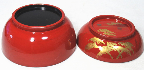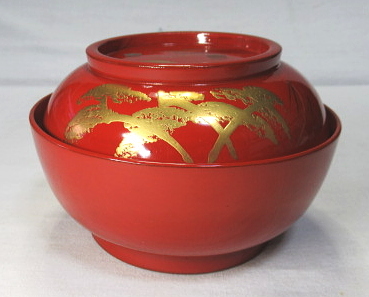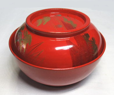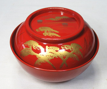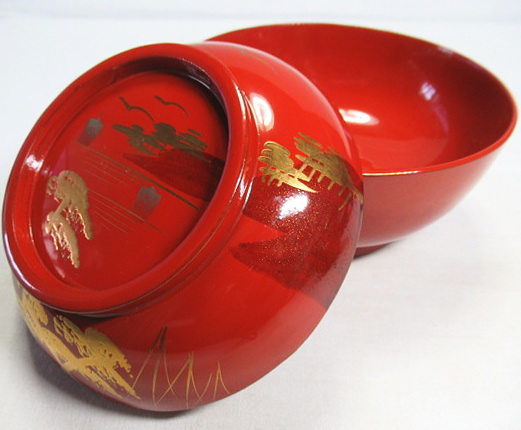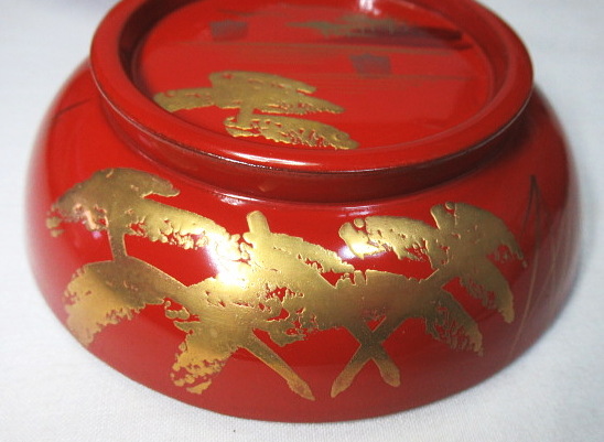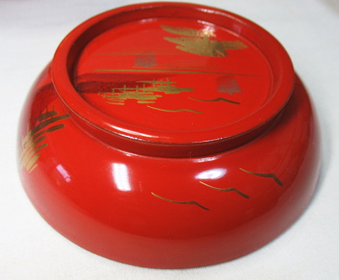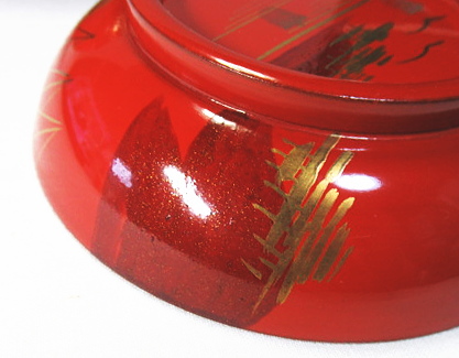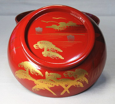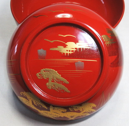 松林の向こうに帆掛け船や山並みが見える蒔絵です。