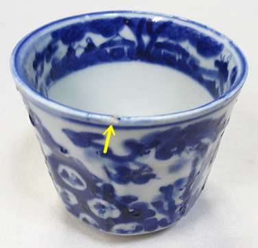 側面に釉爆ぜ複数見られます。 この1客は口縁に釉爆ぜの極小削げがあります。 拡大画像。窯傷で少し膨れたところに釉薬の薄い削げがあります。 同じ1客。高台内側に小削げあります。特に問題ございません。 注文番号:NO.K-1334 閉じる