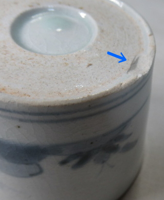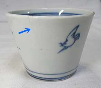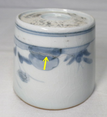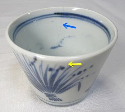 薄い釉割れあります。黄矢印部分は8ミリ程度で見落とすくらいです。