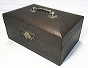 経年の時の流れで、木の味わいが渋くて良い味わいに変化した印鑑箱です。材質は、おそらく栓だと思います。ほぞでしっかりと組んであり、造りは確かですね。金属の持ち手と留め金が付いていますが、そのデザインも優雅で美しい。小物の収納には持ってこいですよ!