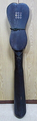 面白い形の槍の鞘です。おそらく瓢箪を模してあるのでしょう。木製で外側は漆仕上げ。厚く塗った漆でおうとつが付けてあります。中央のベルトは銅版と思われます。状態はうぶのままなので、ホコリが付着しておりますが、挿し口あたりに小はがれはあるものの胴部には、さしたる痛みは御座いません。木の無垢の造作なので、なかなか重量感もあり、面白いお品です。