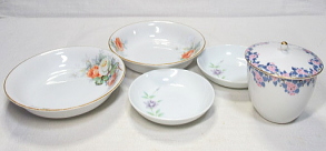 オールドノリタケの蓋付き湯呑と小ボウルと紫バラで人気を博した昭和レトロなファンタジーシリーズの豆皿の5点セットです。湯呑の裏印は張り子人形の形をした珍しい印で、小ボウルの裏印はおなじみの月桂樹に漢字だけが書かれた印でどちらも昭和初期のものです。紫バラの豆皿は昭和36年の東京オリンピックの数年前に出されたファンタジーシリーズです。湯呑の蓋のつまみどれも良い状態のお品です。ただ1点、小ボウル1客にのみ小難がありますが、あまり気にならない程度です。