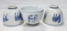 薄造りで上品な煎茶碗です。4頭の馬の絵が楽しそうに描かれたお品。口縁と高台の輪線も美しいですね。傷はございませんが、2客は全体に甘手の釉割れが見られます。煎茶碗ですが、ぐい飲みにも使えそうですね。令和8年は午年ですね。