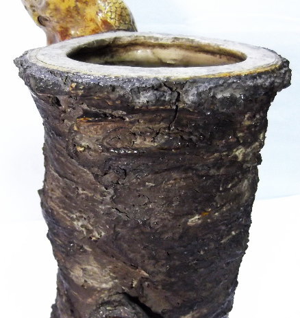 脚に欠損あります。矢印部分。 釜傷のヒビが見られますが、外側は貼り付け仕上げです。 本体(内側)の筒部分にできたものではなく、花活けとして全く問題ございません。 口縁や内側の使用汚れはお手入れしてください。綺麗になると思います。 注文NO.7491 閉じる