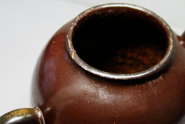 蓋の縁に、釉爆ぜ・ひっつき(緑矢印)とソゲ(黄矢印)があります。共に気になりません。