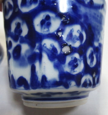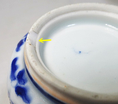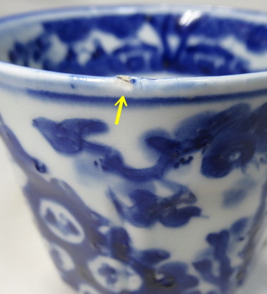 側面に釉爆ぜ複数見られます。 この1客は口縁に釉爆ぜの極小削げがあります。 拡大画像。窯傷で少し膨れたところに釉薬の薄い削げがあります。 同じ1客。高台内側に小削げあります。特に問題ございません。 注文番号:NO.K-1334 閉じる