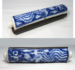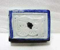 文明開化の華、人力車をモチーフにした少し大きめの染付け水滴です。電信柱をバックに中央に人力車、向って右に車夫といった構図ですね。それが白磁の中央部分に陽刻で描かれております。人気の文明開化物、しかも人気の人力車。コレクターズ・アイテムとしても見逃せませんね。
