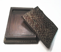黒柿の木をうまく刳り貫いて、硯箱に仕立てた、面白いお品。蓋は自然木そのままに凹凸を生かしてあり、これが良い味わいですね。オーダー・メイドなのでしょう、硯はぴったしに嵌め込まれていて取れません。硯の重さもあるのですが、ずっしりと重い、その様は好感触ですね。木の艶も良く、木の古民芸の味わいは無類です。良い出来の、木工の逸品です。