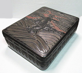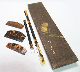 宮津藩主、本荘家は江戸中期の宝暦8年から明治4年の廃藩置県まで 宮津藩主を勤めました。本荘家の家紋は九つ目結いという四角を九つ合わせた紋なのですが、この扇と大根も本荘家の家紋です。大根は、かの忠臣蔵などでお馴染みの桂昌院に繋がるので、この家紋を使用しております。扇のほうは四分一のような台に金象嵌、大根は赤銅に違い大根の紋が貼り付けてあります。いずれも錆び無く良い状態のお品です。