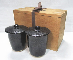 細かな粒々の器肌が面白い雰囲気です。まさに鮫肌、ぷっくりと丸いフォルムも見ていて可愛いです、小型の茶いれですね、つまみの付いた中蓋がついております。器面は艶よく明るい茶色が美しいですね。あまり見かけない備前の珍品だと思います。