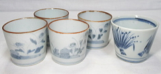 伊万里の蜂の窯印が可愛い上手の蕎麦猪口4客に、同じく伊万里の秋の収穫を祝う図の猪口1客のセットです。口縁に紅ものった猪口は渋い呉須で描かれた草花が可憐で非常によい出来です。また稲束に雀図の猪口はその形が端正で大変美しいですね。口縁内側の輪線模様もいいですね。素敵な猪口ですが、残念なことに全て難ありです。水漏れ等もございませんので、勿論使っていただけます。蕎麦猪口以外にも向付として使ったり、小ぶりの器なのでちょっとしたものを盛ったりと色々とお役立てください。