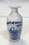 褪めた呉須の色と地肌の色がよい雰囲気を醸し出したお品です。徳利のようでもありますが花瓶でしょうか。小さくて一輪挿しによいですね。水辺の不思議な風景が想像を掻き立ててくれます。ラッパ口のように広がった口縁の下側には藍でぐるっとなぞってあり、目立たぬところまでお洒落に仕上げてあります。口縁に薄い削げがあるのが残念ですが、なかなか捨てがたいお品です。