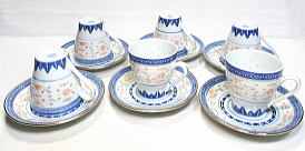 お馴染みの中国製蛍手の美しいデミタスカップ&ソーサー6客セットです。透かし彫りになっているところが光に透かすと美しくぽっと輝きます。真っ白な地に赤絵金彩の繊細な模様と藍色との絵付けが本当に美しいお品ですね。状態も大変よく6客揃っているのも嬉しいですね。飲み物以外にもアイスやゼリーなどスイーツを盛り付けてもいいですね。